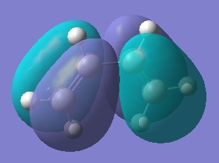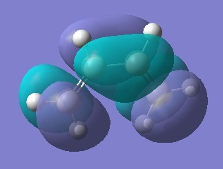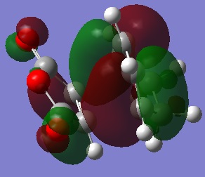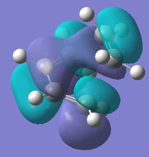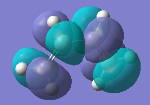 The bond lengths between terminal carbons were 2.11961Å. The HOMO can show which of the two combinations have formed the bonding orbital, in this case it is clear that the HOMO of cis butadiene has formed a new bonding molecular orbital with the LUMO of ethylene. The LUMO has also been shown simply to show that the other interaction is indeed higher in energy and as such the antisymmetric orbitals are the ones that react.