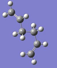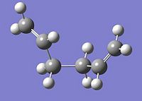 The optimization of the the different conformations of 1,5-hexadiene were obtained in Gaussian and the point group for each of the structures were found. The vibrational frequencies and correct potential energies were calculated and visualized in order to compare them with experimental values. Two conformations of 1,5 hexadiene were initially formed with GaussView, one with anti arrangement whilst the other with a gauche arrangement and both optimized using the HF/3-21G method. These two stable conformations contained three different conformations which were compared with the ones in the Appendix Table 1, comparing energies and point groups respectively. The preliminary calculations are shown in the table below.