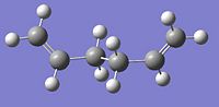 The Anti 2 confirmation of 1,5 hexadiene is considered to be the starting conformation when the molecule under goes a Cope rearrangement. In order to obtain more information, a further optimisation was performed on this structure using the complex B3LYP method with the 6-31G d basic set. The difference in energies predicted from both methods were apporximately 2000 kJ/mol, and is due to the complexity and accuracy of the basis sets used.