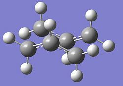 Another method similar to the optimisation method above, is the "freeze coordinate" method. Again, the approximate structure for the Chair transition state as shown above was used, but this time instead of calculating force constants in order to optimise the Chair transition state structure to it lowest energy conformation, the distance between the two pairs of terminal carbons were frozen. The structure was then optimized to its minimum conformation, using the Hartree-Fock method with the 3-21G basic set. The resulting structure was completely optimized apart from the two bonds that are forming/breaking. This structure was used to calculate the structure of the Chair transition state by optimising the two bonds that are forming/breaking. This was done by performing an optimisation on the structure to TS (Berny) telling the calculation to derive the bond lengths between the two pairs of terminal carbons. This was done using again the Hartree-Fock method and the 3-21G basic set. Instead of calculating the force constants in the calculation as was done above in the previous method,a guess Hessian method is used to gain information about the positions of the terminal carbons. The resulting structure of this optimisation for the structure of Chair TS was the same as the structure shown above.