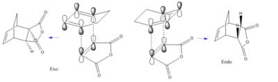 Another example of a Diels-Alder reaction is the cycloaddition of cyclohexa-1,3-diene (1 in Fig.XXX (BELOW) with maleic anhydride (2). Its regioselectivity is of interest and computational techniques can be used to investigate whether the exo (3) or endo (4) product is preferred. It is thought that the endo product is the kinetic product, because although the exo product is more stable, there is a secondary orbital interaction (Fig.XXX) in the endo form which stabilises the transition state which is therefore reached first during the reaction. Since DFT had been shown to give the most accurate results previously, this approach was used to investigate the regioselectivity.