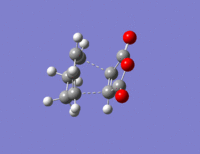The transition state of this reaction is thought to have an envelope structure formed by drawing a bicyclo compound and removing the CH2CH2 fragment. This modification is shown in Fig. XXX. The two fragments separated by the dotted line were then optimised using the AM1 semi-empirical method followed by recombination at a separation of 2.2 Å [11] and TS (Berny) optimisation to generate the transition state. This was then modified using the IRC method 3 and repeated using the DFT approach for comparison DOI:10042/to-12742 , DOI:10042/to-12732 , DOI:10042/to-12741