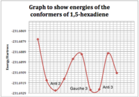 1,5-hexadiene is notable for having 2 dominant conformations - antiperiplanar and gauche. Within these, geometrically distinct orientations of the double bonds relative to the central carbon atom produce further conformations which must be taken into account when performing calculations related to reaction pathways. By optimising the geometry of a 1,5-hexadiene molecule each of these conformers can be identified.