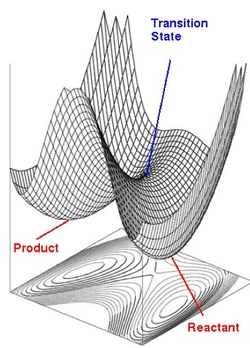 The recent availability of powerful high speed computers has extended the range of applicability of these methods. Since quantum mechanics can be used via ab initio, density functional theory (DFT) and semi-empirical approaches to study any nuclear configuration of molecules, reaction potential surfaces may be explored in intricate detail using the same computational tools as applied for the equilibrium structures of reactants and products. For systems containing more than three atoms there are too many degrees of freedom to allow the full surface to be mapped out discretely. Instead, Born-Oppenheimer potential energy surfaces are characterised by their critical points, minima and saddle points(see Fig.XXX[2]), so that these surfaces can be represented in terms of molecular structures (minima) and transition structures (saddle points) usually supplemented with a quadratic representation of the surface around these points.