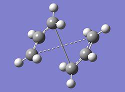 The calculation failed and the structure formed is shown. The correct structure was not ontained because when the calculated reaction interpolated between the reactant and product it did not consider possible rotations around the central C-C bond. In order to obtain the actual structure for the boat transition state manual alterations need to be made to the geometries of the reactants and products in the input file. Firstly, the central C-C-C-C dihedral angle was changed to 0o. Secondly, the inner C2-C3-C4 and C3-C4-C5 adgles were reduced to 100o. This process was repeated for both the reactant and product structures. The manually altered structures are shown below.