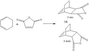 The reaction scheme shown opposite displays a facile reaction between cyclohexadiene and malaiic anhydride. The reaction is a stereoselective Diels Alder reaction in which the endo adduct is the major product. The reaction is kinetically controlled and therefore it is the energy of the transition states that need to be considered. As the exo adduct is the minor product, its corresponding transition state must be higher in energy than that of the endo product. That is to say that the activation energy associated with the formation of the exo product is larger than that associated with the formation of the endo product. In order to locate the two transition structures that correspond to the two products the starting materials for the reaction were modelled using Gausview. As an a good 'guess' can be made as to the geometries of the two transition structures, the starting materials can be arranged accordingly and then be submitted to the following calculation. The job type was set to opt+freq, the method and basis set were HF/3-21G, TS(Berny) was selected and the additional keywords were 'opt=noeigen'The following structures were obtained for the exo and the endo transition states.