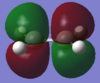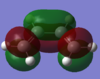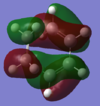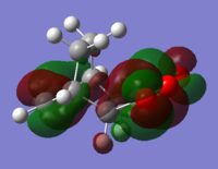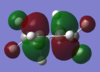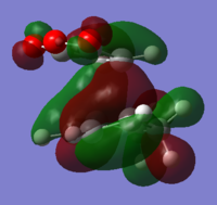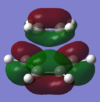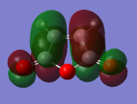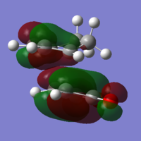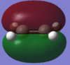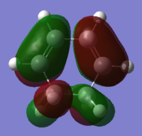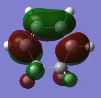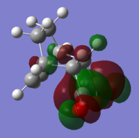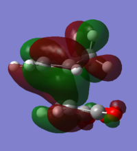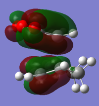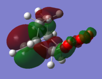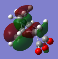 With respect to the plane of the molecule, the HOMO of cis-butadiene is anti-symmetric and the LUMO is symmetric, whereas for ethene both the HOMO and LUMO are anti-symmetric. The interaction between the HOMO of cis-butadiene and the LUMO of ethene leads to the HOMO of the transition state, which is anti-symmetric. This interaction is allowed because the two orbitals have the same symmetry. The transition state LUMO is also anti-symmetric and arrises from the interaction between the HOMO of ethene and the LUMO of cis-butadiene. The partly formed C-C bond length in the transition state is 2.12 Å which shortens to 1.52 Å in the cyclohexene product. A standard C-C bond length is 1.54 Å[1] so this new C-C bond is very slightly shorter, probably because it is part of a ring system. The Van der Waals radius for carbon is 1.70 Å[2] therefore at the transition state bond length of 2.12 Å the Van der Waals radii are overlapping i.e. Van der Waals forces are in place.