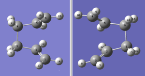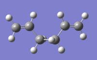 The method and basis set used for the optimisation calculations was HF/3-21G. A molecule of 1,5-hexadiene was drawn in two conformers- anti and gauche. Both conformers were optimised and the results are shown in Table 1.