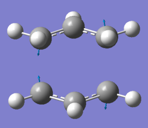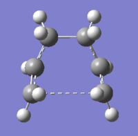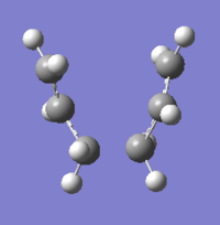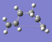 The "guess" transition state was made up from two allyl fragments and is shown in Figure 7. The structure was then optimised to a transition state (Berny) with the force constants calculated once. The optimised structure had an imaginary frequency at -818 cm-1, which corresponds to the Cope rearrangement, i.e. one C-C bond lengthens as the other contracts. The vibration is shown in Figure 8. The energy for the transition state was -231.61932 and the bond breaking/forming distance in the transition state was 2.02 Å.
