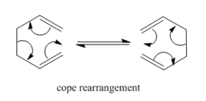 The cope rearrangement is the rearrangement of a terminal diene. The aim for this tutorial is to determine the most stable intermediate through which the rearrangement occurs. The molecule can be in one of two conformations, based on the four central carbon atoms, anti- or gauche, and the rearrangement proceeds through either a chair or boat intermediate.