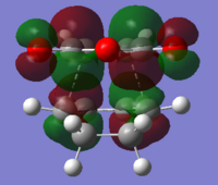 The bond breaking/forming length in the TS is 2.12 Å. The typical sp3 C-C bond is 1.53 Å, and sp2 C=C bond is 1.34 Å. Van de Waals Radius of carbon is 1.70 Å.[2] The bond breaking/forming length is shorter than the Van de Waals interaction betweent two carbon atoms which is 3.40Å. However, it is longer than sp3 and sp2 C-C bond length. This means that the carbon atoms are approaching each other within the Van de Waals radii region for bond formation, but the bonds are partially formed and broken. This fits with the transition state theory. According to the quantum theory,the symmetry of the molecular orbital formed form the overlap of two atomic orbitals, have to be the same as that of the initial orbitals. In addition, only filled orbitals can overlap with empty orbitals and vice versa. This can be explained by Pauli exclusion principle[8] and Hund's rule[9]. The HOMO is antisymmetric, whereas the LUMO is symmetric. The negative frequency at -956 cm-1 which indicates formation of the two bonds is synchronous. The lowest positive frequency at 147 cm-1 is the rocking vibration which indicates the motion of the viration is asynchronous.