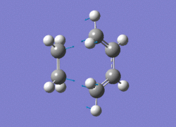 The calculation was successful and modeled the transition state well. The presence of one imaginary vibration at 839.97cm-1 confirmed a successful calculation. This frequency corresponds to the global maximum of the transition state. For the boat transition state the distance between the terminal carbon atoms was found to be 2.14A. The imaginary vibration representing the Cope reaction coordinate can be seen below