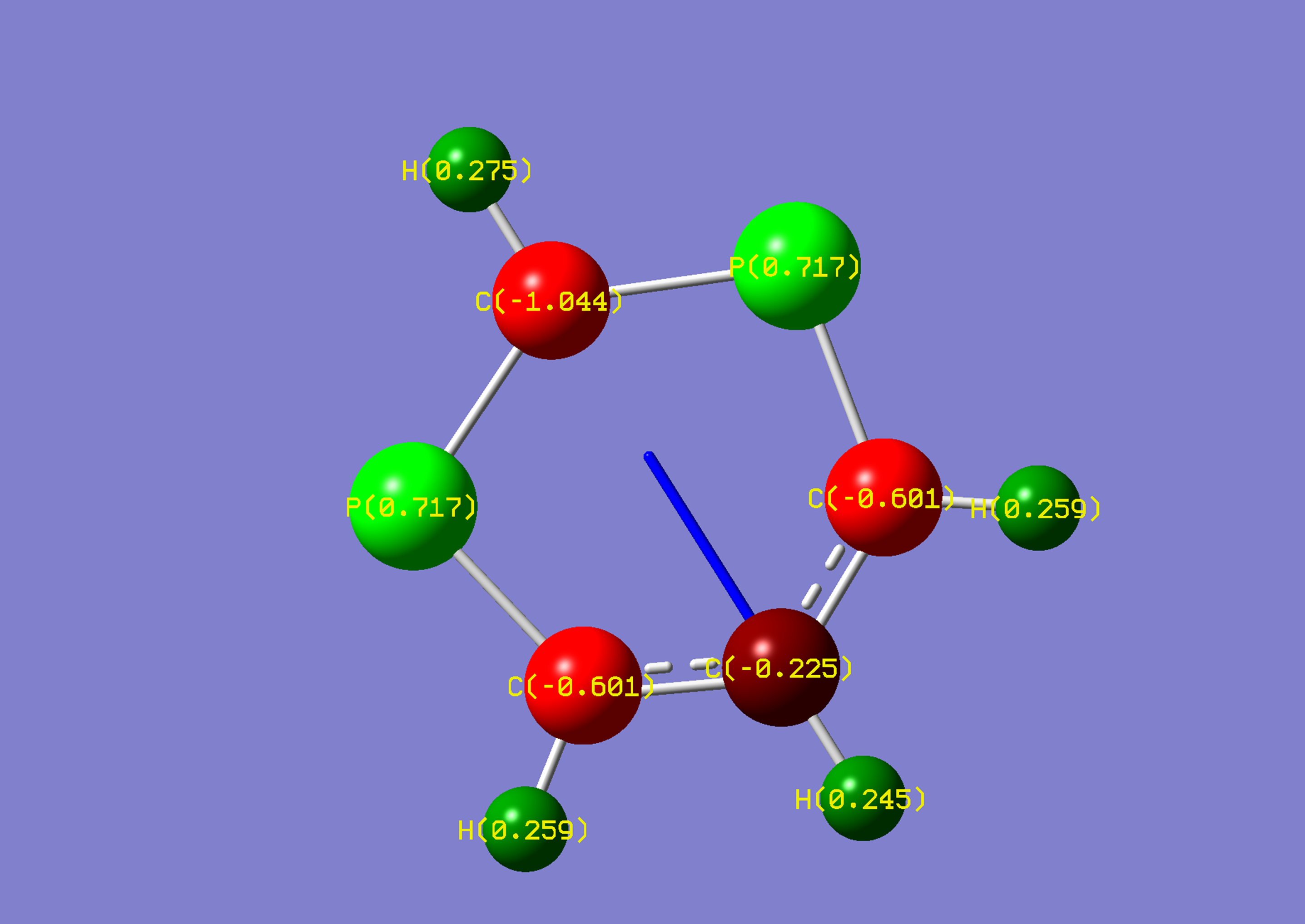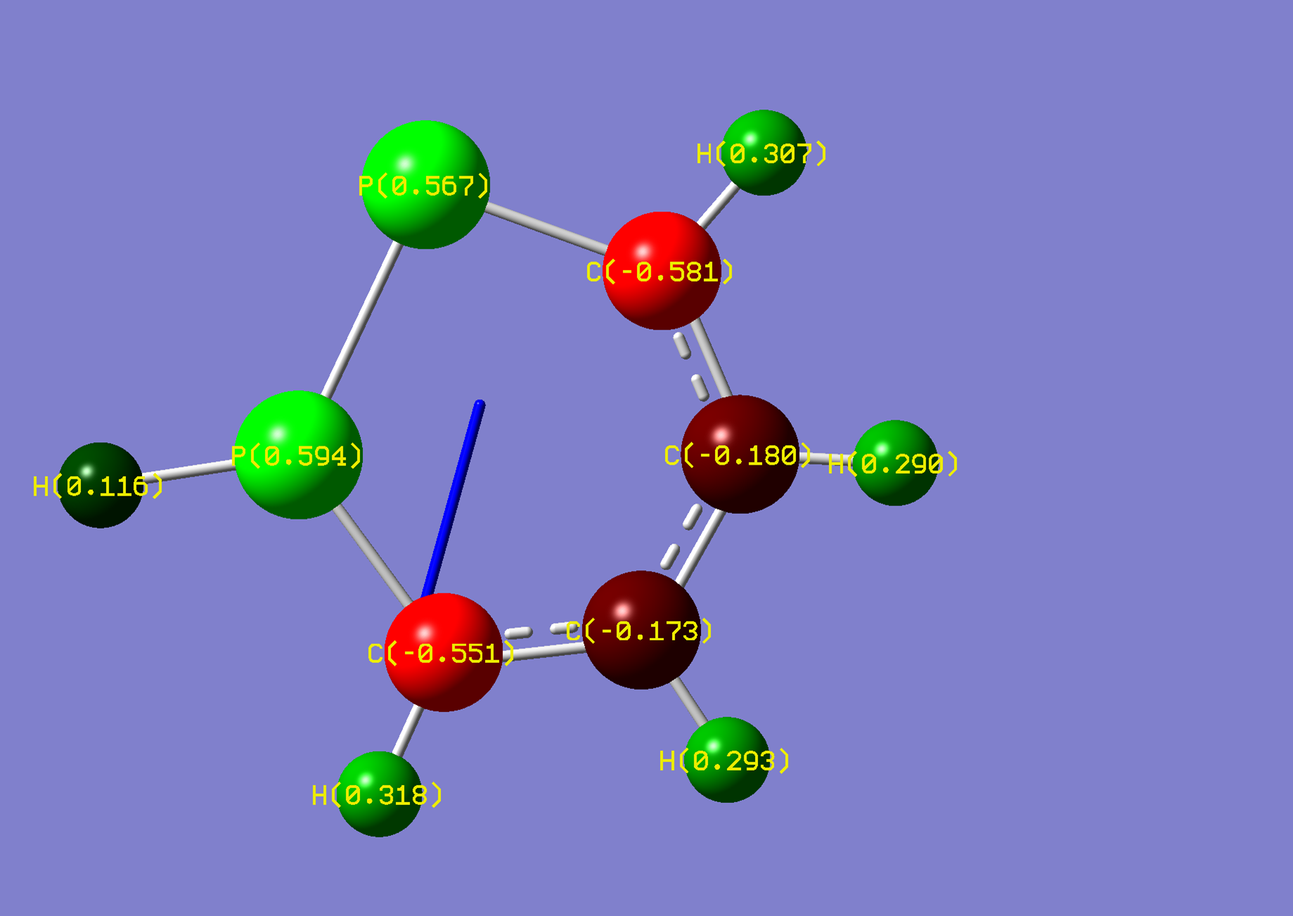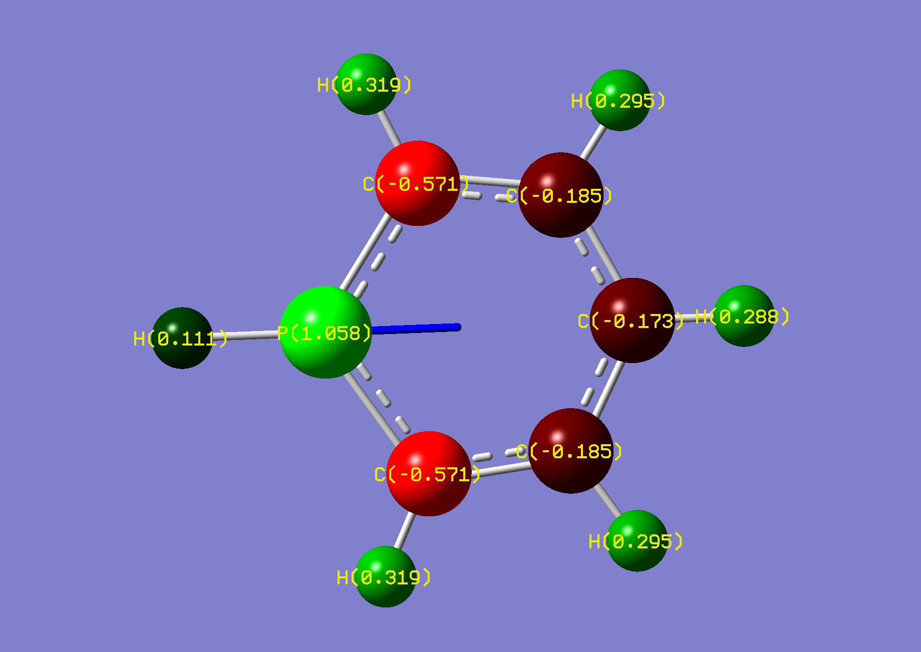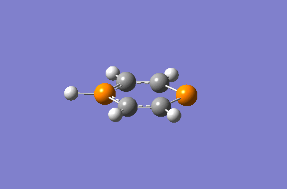 Gaussian calculated the phosphorus hydrogen as being in plane with ring. However, the negative frequency was inspected as vibrating the hydrogen out of plane. Another optimisation was conducted after 'nudging' the hydrogen out of plane manually.