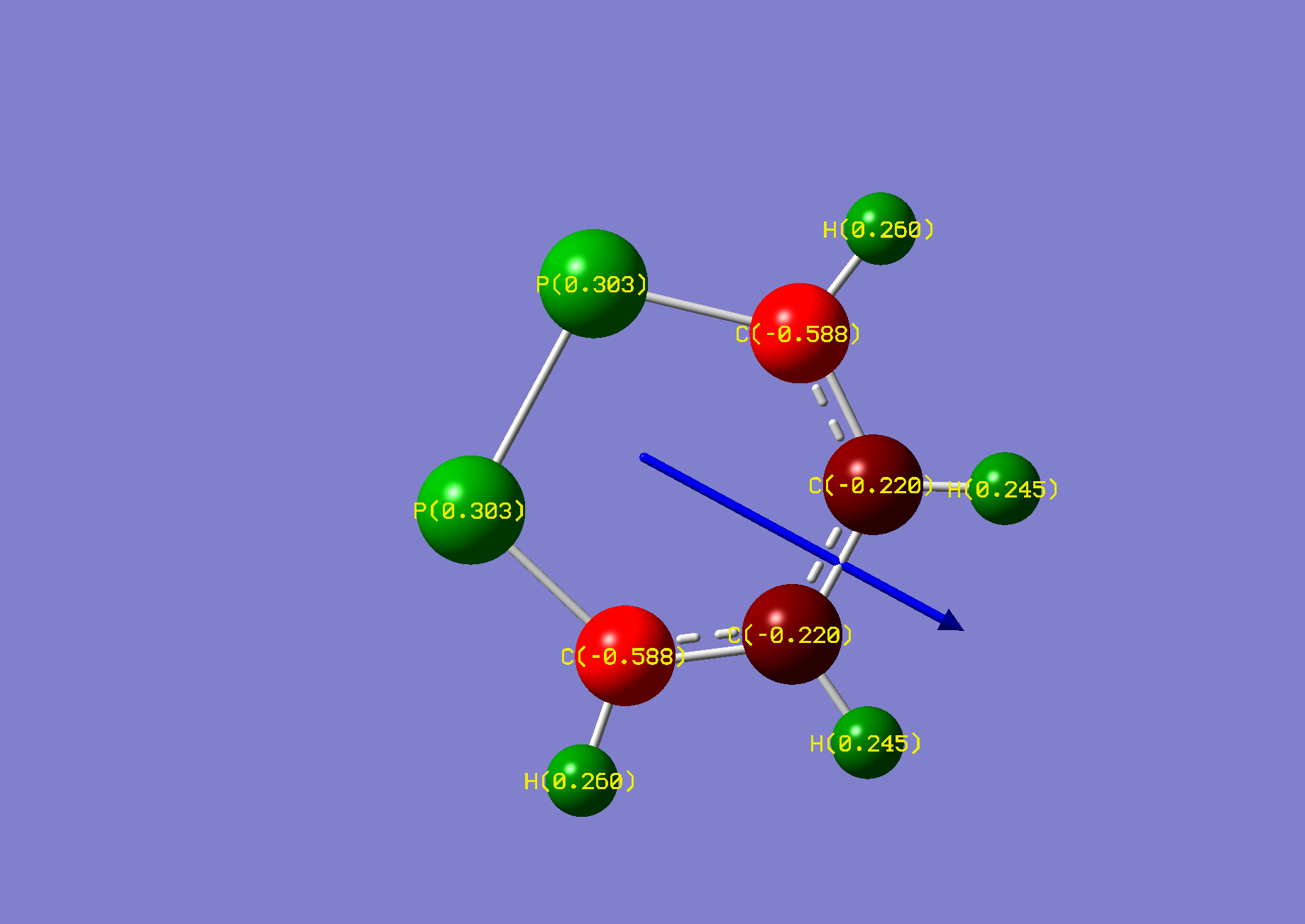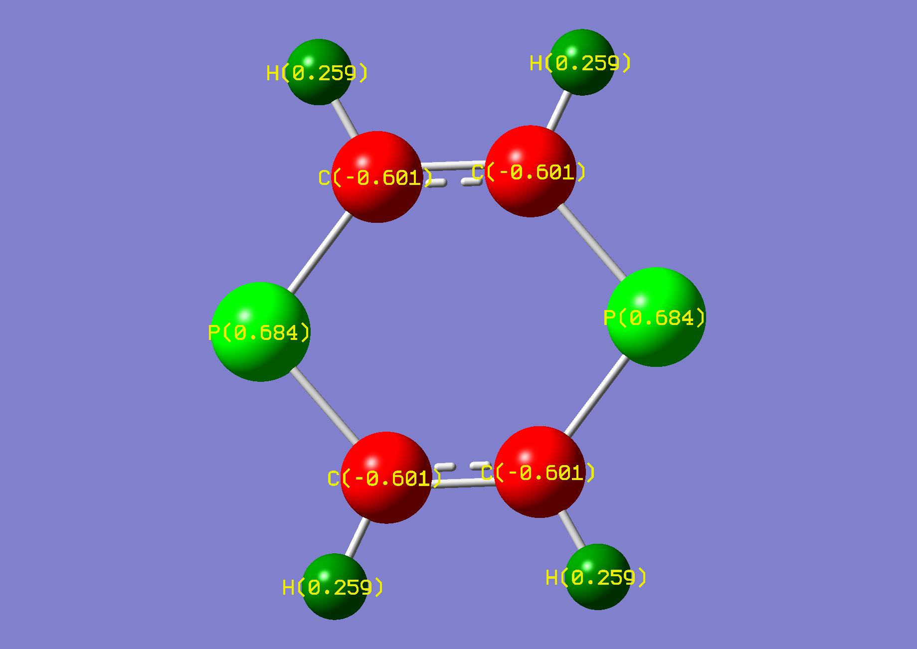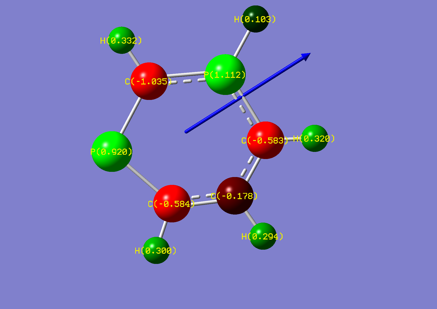 Gaussian calculated the phosphorus hydrogen as being in plane with ring. However, the negative frequency was inspected as vibrating the hydrogen out of plane. Another optimisation was conducted after 'nudging' the hydrogen out of plane manually.