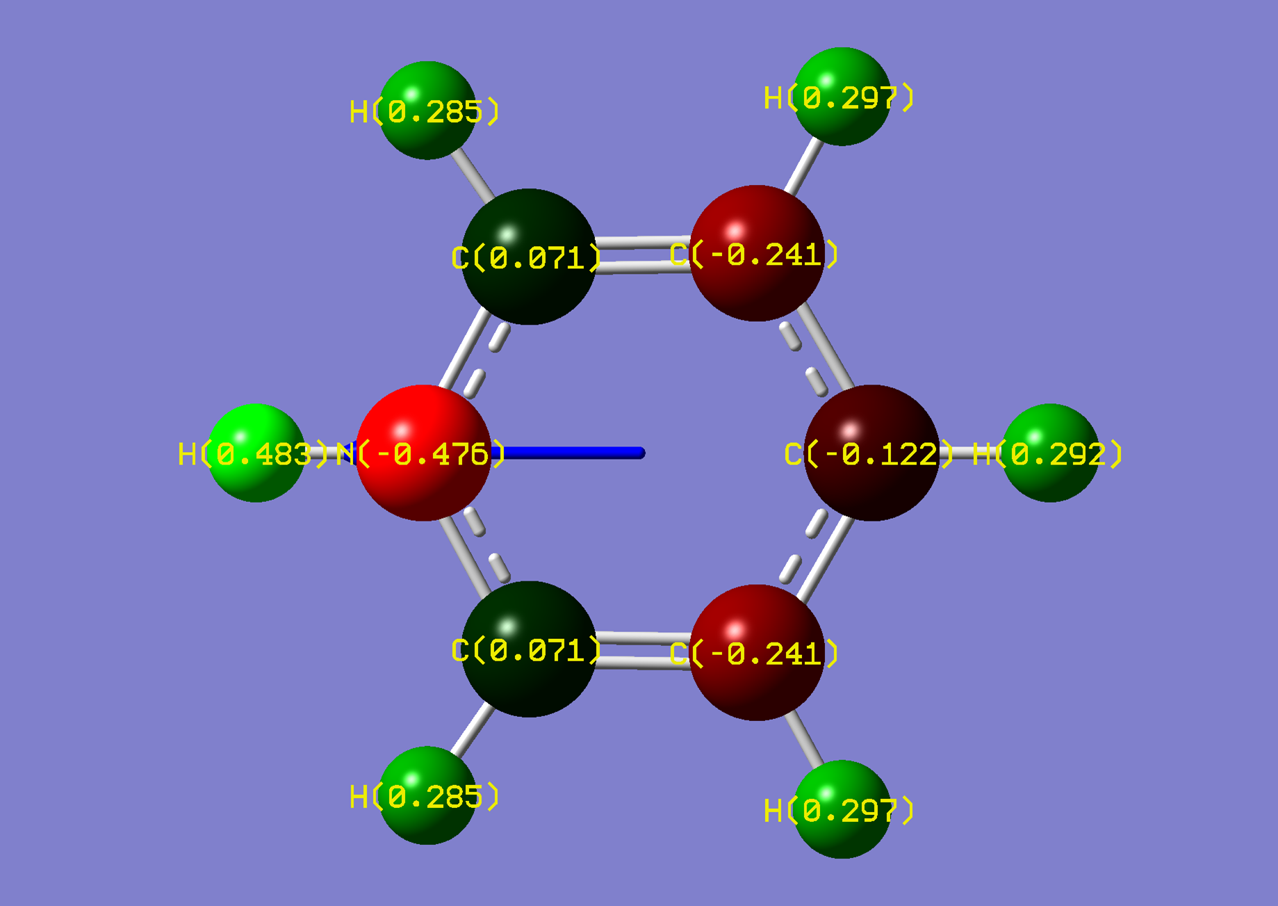 | Comments: | A dipole moment is induced, suggesting an increase of solubility in aqueous acidic environments. Symmetry is lost upon protonation. | |||