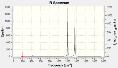 The optimised F-C-F bond angle was 113.716°, compared with the literature value of 104.35°[4]. This agreement was less close and could have been more strongly influenced by differences in assumed conditions when modelling versus in the real experiment, including medium and temperature.