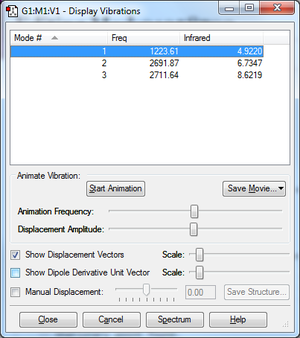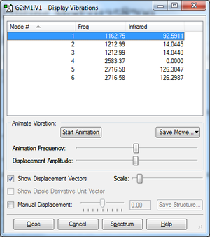 From 3N-6 rule I would expect 6 modes. 1-3 are bending vibrational modes and 4-6 are stretching vibrational modes. 2,3 and 5,6 mode are degenerate. In the experimental spectrum I would expect to see 3 modes (1,2&3,5&6) since mode 4 will not show in IR (no dipole moment change).