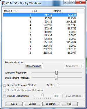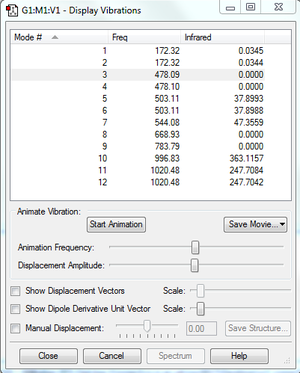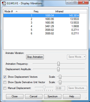 Modes 1, 2, and 3 are bond bend vibrations, and modes 4, 5, and 6 are bond stretch vibrations.