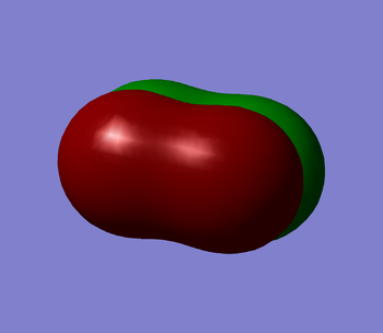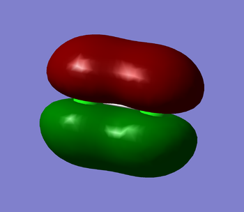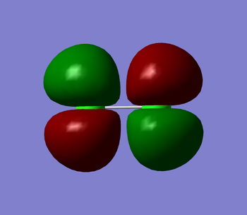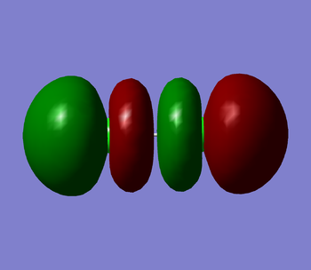 Cl2's homo is a 3π star antibonding molecular orbital (MO) in the x plane (shown in figure 1 below). It is the orbital in which the last electron has been placed. It's energy value is -0.31362. This MO is made up of 2 3p atomic orbitals and contains the maximum number of 2 electrons. As this is an antibonding orbital it has a negative effect on the bond order of the molecule. Cl2's lumo is a 3π star antibonding orbital in the z plane (shown in figure 2 below). This is the first empty molecular orbital that Cl2 has. It's energy value is -0.14211. This MO also is made up of 2 3p atomic orbitals. As the orbital is empty it will have no effect on the bond order of the molecule. Cl2's first MO is the 1σ orbital (shown in figure 3 below). It is made from 2 1s atomic orbitals. It is a bonding orbital that contains 2 electrons and therefore contributes positively towards the bond order of the molecule. it is very deep in energy. It's energy value is -101.60299. Even though the orbitals contributes to the overall bond order of the molecule, the atomic orbitals hardly overlap as they are held tightly near their nuclei so they are not very involved in the chemical bonding itself. The final two figures (figures ̩4 and 5 below) show the 3π bonding orbitals in the x and y plane. These two MO's are degenerate both with an energy of -0.40693. They were both made by the overlap of the 3p atomic orbitals. These orbitals are bonding orbitals and so they contribute positively to the bond order.