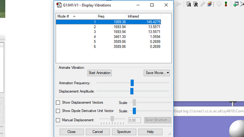 How many modes do you expect from the 3N-6 rule? From the 3N-6 rule, we expect to find 6 modes ( 3(4)-6=6 ). Which modes are degenerate (ie have the same energy)? There are 2 sets of 2 modes that are degenerate. The first set has a wavenumber of 1694 (modes 2 and 3) and the second set has a wavenumber of 3590 (modes 5 and 6). Which modes are "bending" vibrations and which are "bond stretch" vibrations? Modes 1,2 and 3 are bending vibrations and modes 4,5 and 6 are stretching vibrations. Bending a bond is easier than stretching it, so bending vibrations have lower energies than stretching vibrations. Which mode is highly symmetric? Mode number 4 (at wavenumber 3461) is a highly symmetric mode. One mode is known as the "umbrella" mode, which one is this? The "umbrella mode" is mode number 1 with a wavenumber of 1090. How many bands would you expect to see in an experimental spectrum of gaseous ammonia? There are 4 distinct sets wavenumbers so we would expect to see 4 bands in an experimental spectrum of gaseous ammonia.