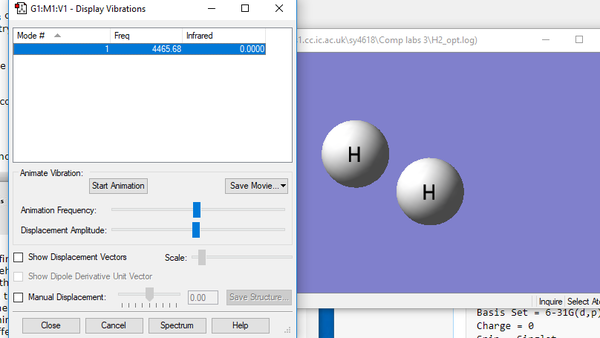 H2 optimisation: Calculation Type = FREQ Calculation Method = RB3LYP Basis Set = 6-31G(d,p) Charge = 0 Spin = Singlet E(RB3LYP) = a.u. RMS Gradient Norm = 0.00000000 a.u. Imaginary Freq = 0 Dipole Moment = 0.0000 Debye Point Group = D∞h