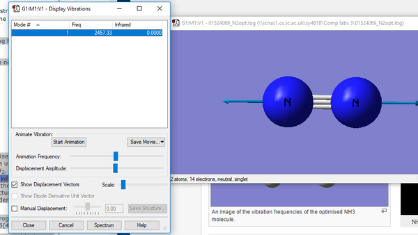 N2 optimisation: Calculation Type = FREQ Calculation Method = RB3LYP Basis Set = 6-31G(d,p) Charge = 0 Spin = Singlet E(RB3LYP) = -109.52412868 a.u. RMS Gradient Norm = 0.00000000 a.u. Imaginary Freq = 0 Dipole Moment = 0.0000 Debye Point Group = D∞h