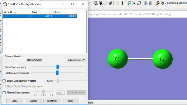 Cl2 optimisation: Calculation Type = FREQ Calculation Method = RB3LYP Basis Set = 6-31G(d,p) Charge = 0 Spin = Singlet E(RB3LYP) = -920.34987884 a.u. RMS Gradient Norm = 0.00000000 a.u. Imaginary Freq = 0 Dipole Moment = 0.0000 Debye Point Group = D∞h