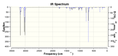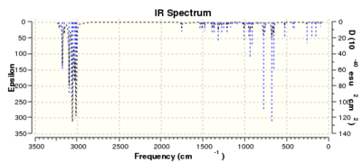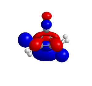 The point point group is detected and is displayed in the output file at the start and end of the calculation[3]. Therefore, the MOPAC/PM6 calculation was repeated using the AUTOSYM keyword. As you can see from the output file the point group was correctly identified as Cs. However, the orbitals were still asymmetric about the molecule's plane of symmetry. It was concluded that this must be a bug in the calculation and a different method must be chosen. The view shown of the HOMO, looking down the σ-plane, is a good example of the asymmetry generated by MOPAC/PM6 through ChemBio3D.
