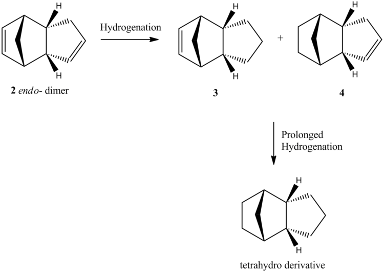 The product (2) of the dimerisation undergoes hydrogenation to initially give only one of the two dihydro derivatives, 3 and 4, as shown is Scheme 4. After prolonged hydrogenation this eventually gives the tetrahydro derivative. Again, molecular mechanics can be used to calculate the relative energies of 3 and 4. By analysing the relative contributions to the total energy of each molecule, one can attempt to rationalise their relative stabilities and use this to predict which of the two molecules is formed.