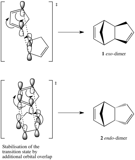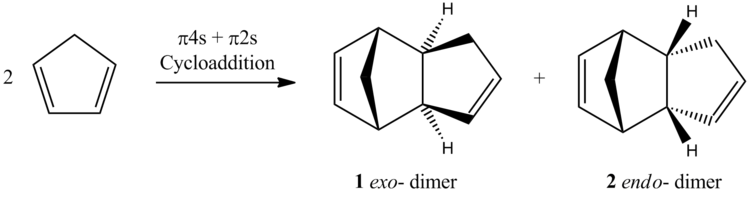 Cyclopentadiene undergoes a π4s + π2s cycloaddition to dicyclopentadiene. This reaction has two potential products, the exo- isomer (1) and the endo- isomer (2), shown in Scheme 2 (relative sterochemistry). However, only formation of the endo- isomer is observed.