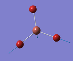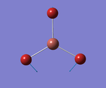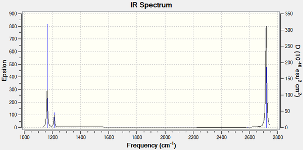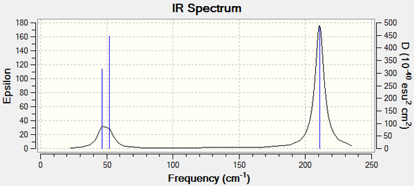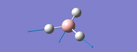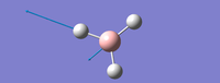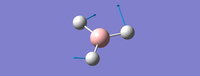 There are only 3 peaks in the IR spectrum, where there are 6 vibration modes. The large peak at 1162cm-1 is due to the wagging motion of the BH3 molecule. The next much smaller intensity peak at 1213cm-1is due to both the scissoring and rocking motion which vibrate at the same frequency. The symmetric stretch at 2585cm-1 is not visible due there being no change in dipole moment. The final large peak at 2718 is due to the two antisymmetric stretches. Thus there are only 3 visible peaks on the IR spectrum.