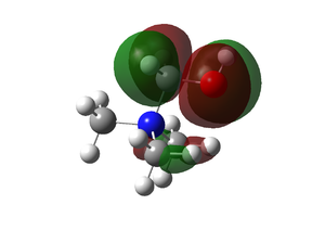 The addition of the -OH group has caused the whole system to be raised in energy. Both the HOMO and LUMO have been raised in energy, HOMO-LUMO gap is smaller however. Even though the HOMO-LUMO gap is smaller the energy of both being raised will cause the molecule to be less reactive as electrons from another molecule are less likely to be donated into the system due to the high energy LUMO. The high energy HOMO may also mean the molecule slightly less stable, this can also be rationalised in the MO as there is a lack of bonding interactions in the Molecular Orbital compared to N(CH3)4+ HOMO.