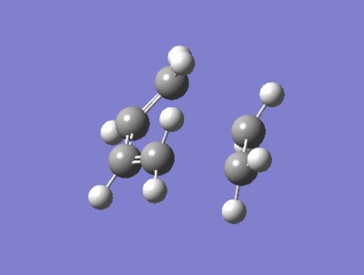 When looking at the gif file for the above optimization, it was seen that I had left too many hydrogens on carbon 2 and carbon 4 of the cis butadiene fragment, therefore the optimization calculation was redone, shown below. [Cyclohexene ts opt freeze part 1] [Cyclohexene ts opt freeze part 2]