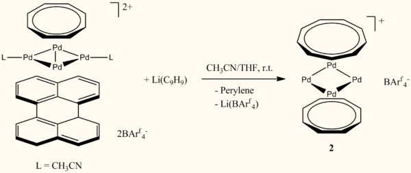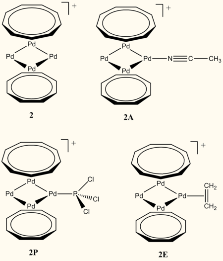 Optimised geometries of 2, 2A, 2E and 2P can be seen in the Jmol applets above. Coordination appears to cause a distortion in the tetra-palladium ring from a square to a rhombus. The Pd-Pd distance in line with the coordinating ligand increases and the Pd-Pd distance perpendicular to the coordinating ligand decreases. This is in comparison with uncoordinated 2, where the Pd-Pd distances across the ring are 0.389nm and 0.386nm. This has been quantified by a "distortion factor", which is the Pd1-Pd4 bond distance divided by the Pd2-Pd3 bond distance and can be thought of as the ratio between the distances across the palladium ring. Uncoordinated 2 has a distortion factor of 1.01. Interestingly, ethene and trichlorophosphine have much larger distortion factors than acetonitrile, with ethene having the largest.