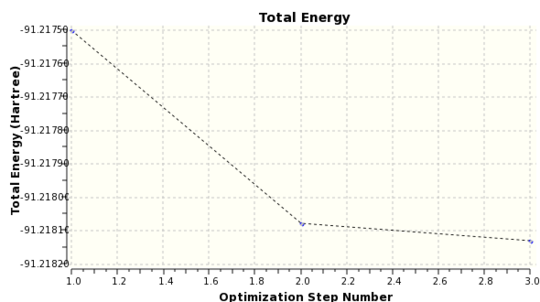 The path of the optimisation was visualised using the animation, which showed the bond lengths shrinking from the starting structure to the final geometry. Plots of Total energy and RMS gradient norm can be seen below.