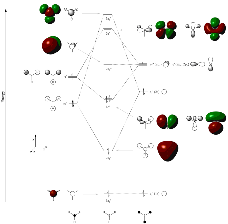 The molecular orbital diagram for BH3 can be seen below, constructed from the boron atomic orbitals and the D3h H3 fragment. Snapshots of the B3LYP/3-21G calculated molcecular orbitals can be seen along side the "LCAO" molecular orbitals for comparison. Ordering of the molecular orbitals was assisted by the quantitative relative energies of the B3LYP/3-21G calculated orbitals.