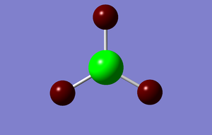 A model of TlBr3 was constructed in Gaussview 5.0. The trigonal planar thallium fragment was selected and each of the hydrogens were replaced by bromine atom fragments. The point group symmetry was constrained to D3h with a very tight (0.0001) tolerance. A gaussian input file was prepared, through the Gaussian calculation setup menu, to perform an optimisation, specified by: # opt b3lyp/lanl2dz geom=connectivity. The input file was saved as TlBr3_opt.gjf and submitted to Gaussian 09[1].