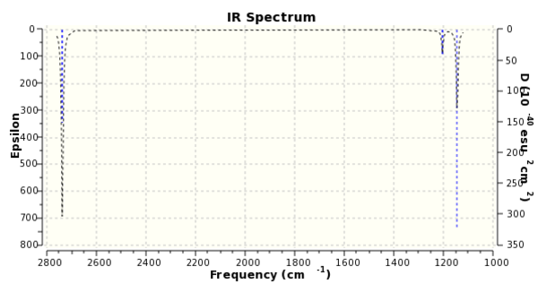 Examination of the predicted IR spectra reveals only three peaks despite there being six vibrational modes. A' is totally symmetric and does not results in a change in dipole moment, unlike the other vibrational modes present for D3h symmetry. This makes the A' stretch at 2598 cm-1 IR inactive, hence why it does not appear on the spectra. The two pairs of E' modes are degenerate, which means each of the component vibrations occur at the same frequency and intensity, appearing as a single peak on the spectra. The outcome is a peak at 1144 cm-1 corresponding to A", a peak at 1204 cm-1 corresponding to the first E' pair and a peak at 2737 cm-1 corresponding to the second E' pair.