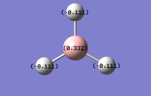 The charge distribution shows that there is a build up of electron density on the hydrogens, coupled with a reduction of electron density on the boron. This reflects the Pauling electronegativities of boron and hydrogen at 2.04 and 2.20 respectively.