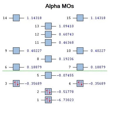 The calculation was run through Gaussian 09 on the SCAN cluster and took 12.6 seconds. From the formatted checkpoint file, cube files for the first eight molecular orbitals were generated through Gaussview 5.0 and converted to the .jxvl format using the Jmol java app. These can be visualised using the Jmol applet and Jmol script buttons below.