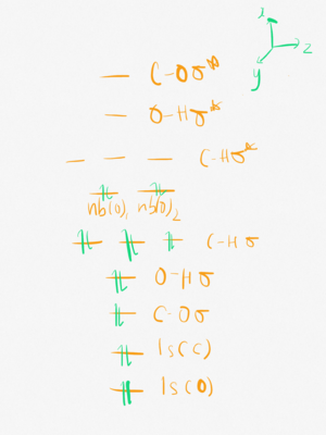 As CH3OH is a slightly more complex molecule, the molecular orbitals that have been calculated are not as simple as that of homodinuclear or heterodinuclear molecules. However, using a simplified MO diagram of CH3OH, the different MOs can be distinguished based on their energy levels. It is important to note that the electrons in methanol only occupy the bonding and non-bonding MOS, and not the high energy anti-bonding MOs which would destabilise the molecule.