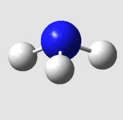 There are two different degenerate vibrations - one at 1693.95 cm-1 (modes 2 and 3) and the other at 3589.82 cm-1 (modes 5 and 6). Modes 1 to 3 are bending vibrations and modes 4 to 6 are stretching vibrations. This is also reflected in their frequencies as the frequencies of the stretching vibrations are higher than that of bending. Mode 4 is highly symmetric and mode 1 is known as the "umbrella" mode as the three H atoms are moving out in a motion akin to opening an umbrella. In an experimental spectrum of gaseous ammonia, 3 bands would be expected as there are 3 different frequency values computed. However, only two bands would be clearly visible, this is due to the intensity of the higher energy vibrations which is very low.