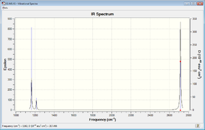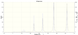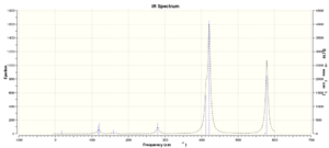 The IR spectrum shows that there are only three peaks. Initially we may expect six because that's how many vibrational modes are calculated; however, the one at 2582.28 cm-1 has a zero intensity - this is because it is a totally symmetrical vibration. The peak at 1213.18 and 1213.19 cm-1 will overlap into one peak, their intensities are the same to 2 d.p. and their symmetry is the same. Finally, there are two peaks with identical frequencies at 2715.45 cm-1 with equal intensities up to 2 d.p., and the same symmetry of E'. This brings us to three peaks: 1163.00, 1213.18, 2715.45 cm-1.
