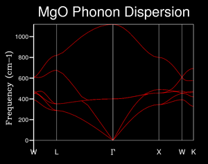 It may be seen in Image 2 that each k-point has 6 phonons, and that the phonons are sometimes degenerate (for example, there are only 4 distinguishable phonons at k = L and at k = X). All 50 k-points are represented along the x-axis. The rationale behind 6 phonons is that each unit cell contains 2 atoms (one magnesium and one oxygen) which can both vibrate along 3 directions (x, y and z) to give 6 possible vibration bands.