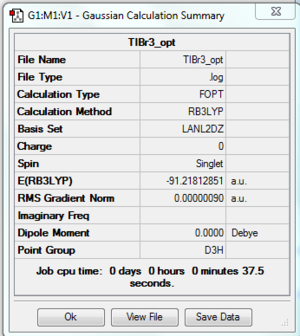 Moving on from the small BH3 molecule the much larger TiBr3 is created, with a total of 186 electrons this requires the use of more advanced processing power to optimised the molecule. Again, using GaussView 5.0 the TlBr3 molecule was made its geometry was tightly restricted to D3h and the calulation set to optimisation using B3LYP and a medium basis set of LanL2DZ this job was submitted to SCAN and the files are shown below. The Tl-Br bond distance was found to be 2.65095 angstrom, the lit value of Tl-Br was found to be 2.512 angstrom, and the Br-Tl-Br bond angle to be 1200. The proof that the molecule was fully optimised shown below. File:Georgedoucy TlBr3 opt.log