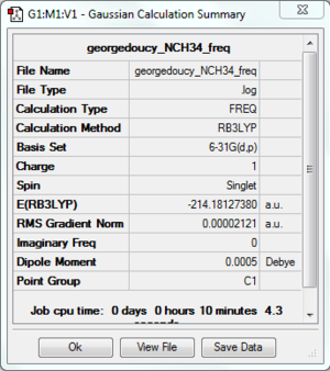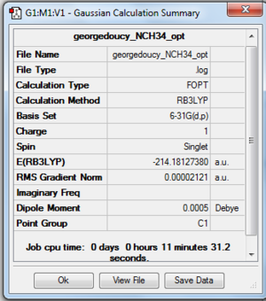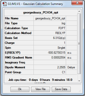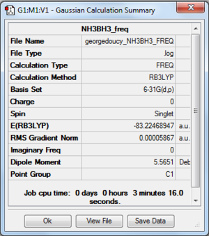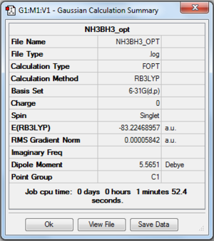 But has the molecule been optimised? It looks very similar to the created BH3, to give evidence of the optimisation we look to the summary, shown right, giving a gradient close to zero gives some proof but checking the .log file as seeing if it has converged makes it definitive. The .log file indicates all the information produced during the Gaussian calculation, near the end of the log file (attached below) a table is seen indicating that the convergence has occurred.