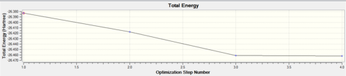 Opening the log file with the "Read Intermediate Geometries" allows additional graphs to be viewed (shown below), showing the change in energy and gradient as the optimisation takes place. The Total Energy graph shows each optimisation step going lower in energy until it reaches the optimised structure, the second graph shows Root Mean Squared Gradient graph and as each optimisation occurs it becomes closer to zero. When almost zero gradient obtained the program knows that the optimised structure has been achieved.