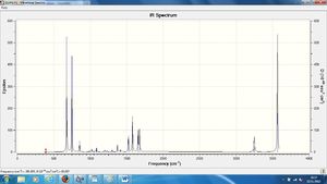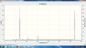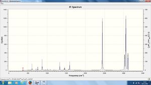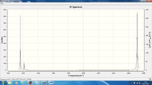 As seen from the data the calculations all ran correctly, there are no negative frequencies seen and all have the required difference of a magnitude of ten. Shown below are the frequencies present with their intensities, also shown is the IR spectra.