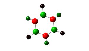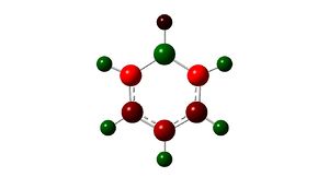 The charges on atoms in a Borazine molecule are different to those seen previously as the prescence of different atoms in the main frame of the ring affects the charges felt by the hydrogens. The charges can be seen broadly looking at the picture below which indicates the more polar ends of the molecule in different colours, red = -1.102D and green = + 1.102D.