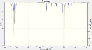 No negative (imaginary) vibrational modes were present in the vibrational data for any of the DFT-optimised anti2 conformation, indicating that the structure has been successfully optimised to a minima (as opposed to a transition state maxima, which would produce a negative vibrational frequency). The simulated Infrared spectrum for the Anti 2 conformation is shown below in Figure 4 .
